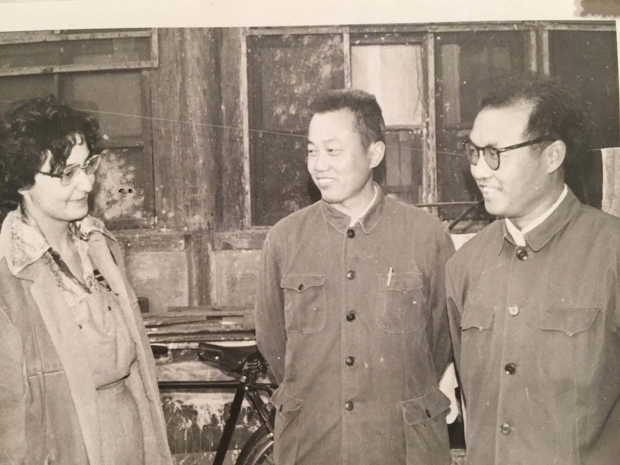 Prof. Karine Chemla (first from left) talking with Prof. Guo Shuchun (first from right) at the Institute for the History of Natural Sciences, CAS in 1983.